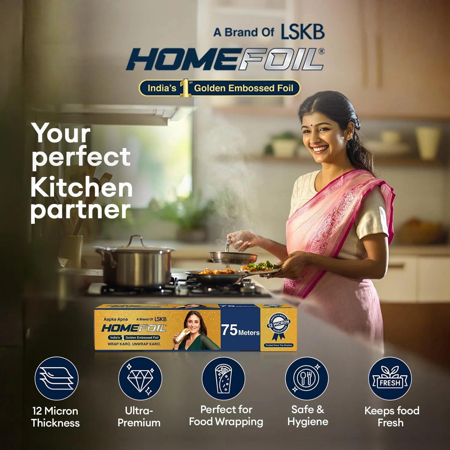 • HOMEFOIL is the Premium range of India's 1st Golden Embossed Aluminium Foil. It always keeps Food Fresh & Warm, Safe, Hygienic and Highly Presentable